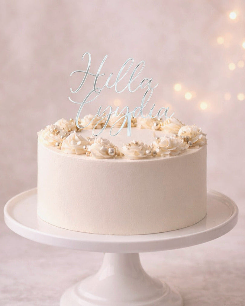 Tee juhlasta ainutlaatuinen personoidulla akryylisella kakunkoristeella! Valmistamme koristeet huolella korkealaatuisesta akryylistä ja koivuvanerista – saatavilla peilihopeana, peilikultana, valkoisena, mustana ja koivun omassa luonnollisessa värissään.